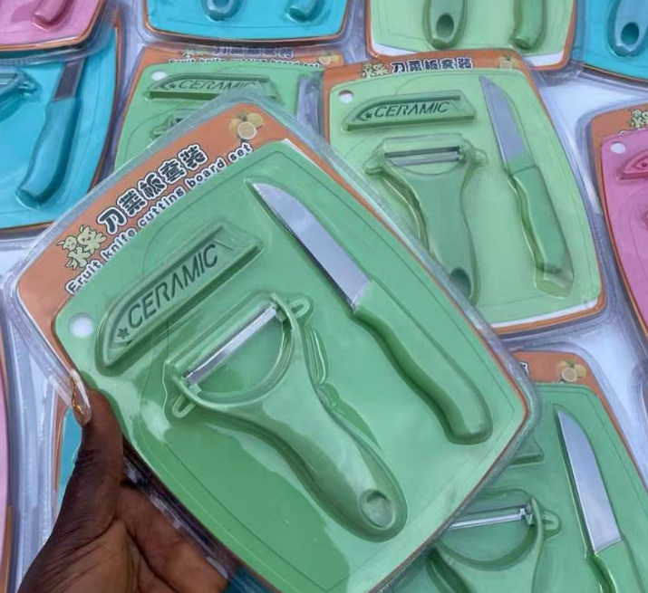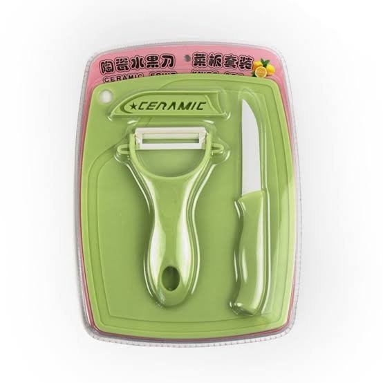 ceramic 3-in-1 kitchen set featuring a fruit knife, peeler, and mini cutting board, commonly sold as a party souvenir