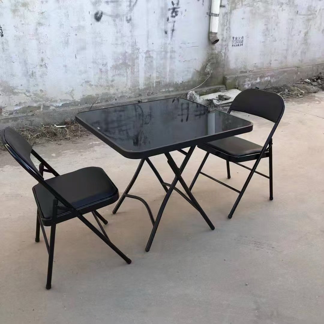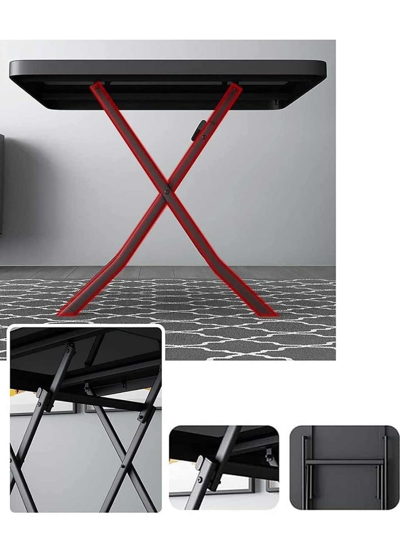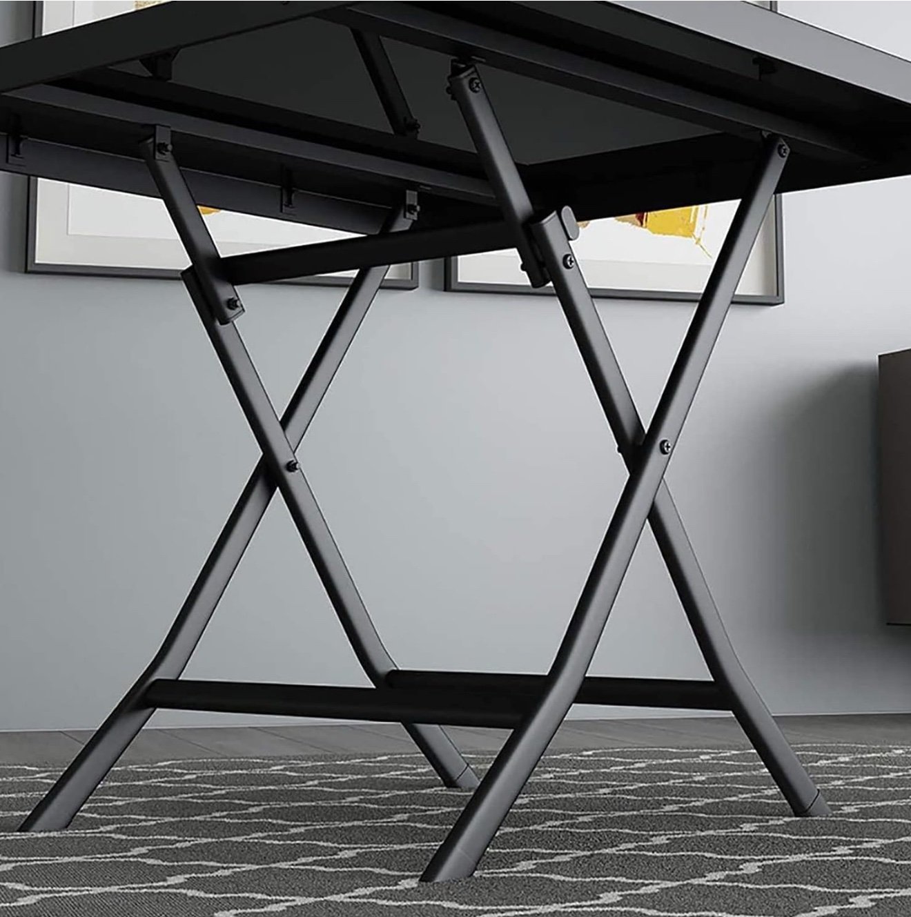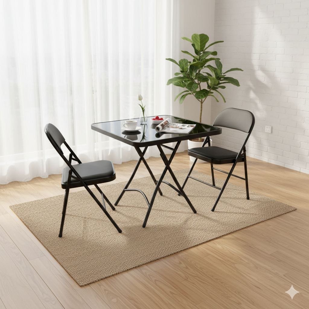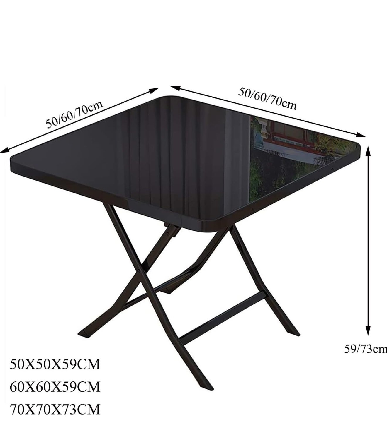 A folding table with a Tempered glass top and a metal frame for durability, stability and rust-resistance. It is designed for space saving and easy storage. It includes a rounded edge for safety and they are designed for multifunctional use like laptop desk, dining table or cocktail table.