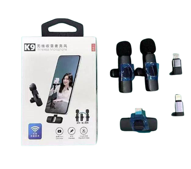 K9 Wireless Microphone system, a popular budget-friendly lavalier (lapel) mic used by content creators for vlogging and live streaming. This specific set is a dual microphone version, meaning it includes two transmitters for recording two people simultaneously.