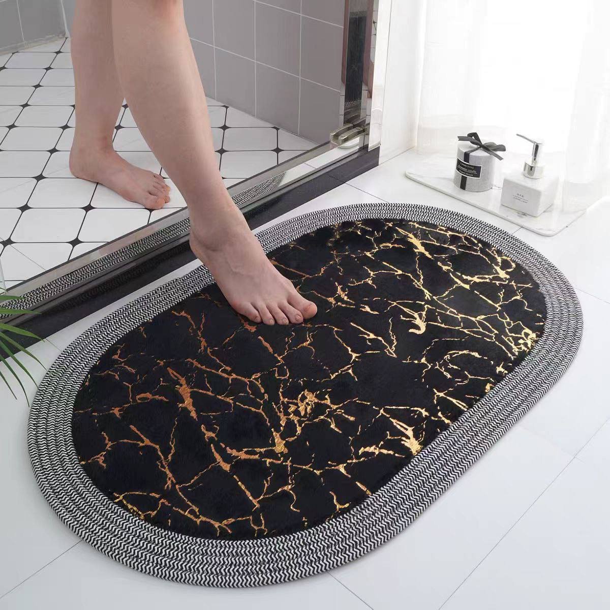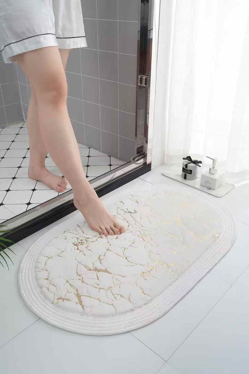 This luxury bathroom mat features an oval shape with a white and gold marble texture design. Often described as “super absorbent” and “quick-drying,” these mats are designed for use in bathrooms, shower areas, and near sinks to keep floors dry and safe.