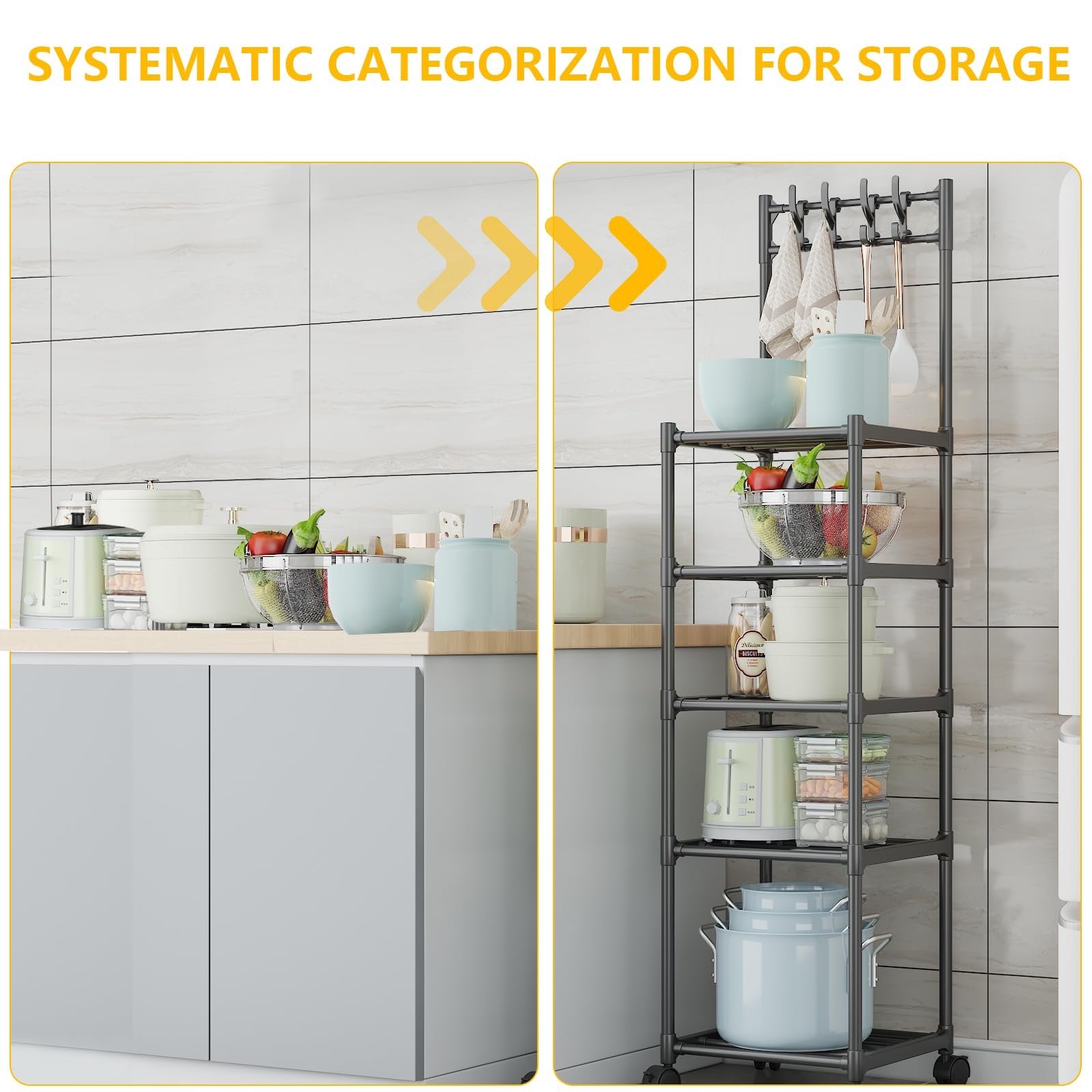 5-tier movable kitchen storage rack with hooks and wheels- Type A