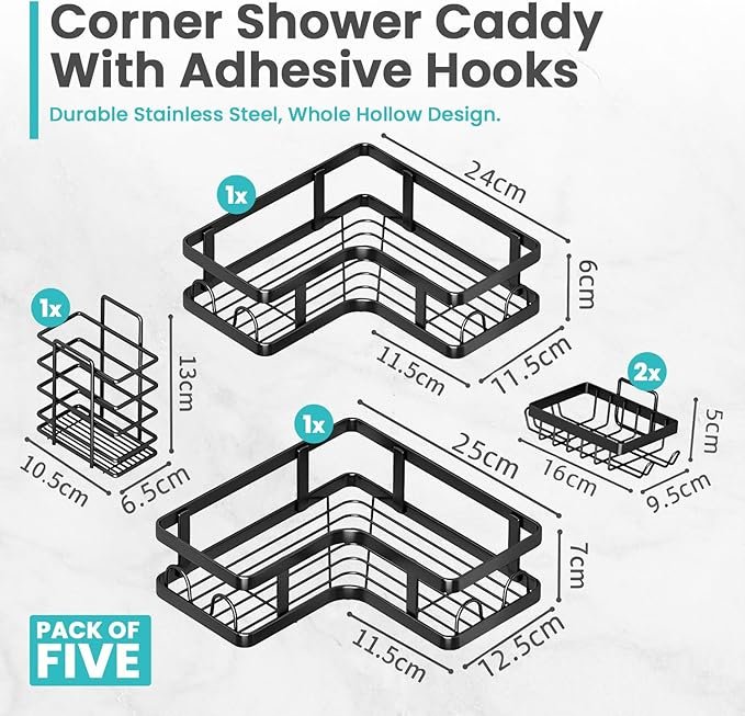 • āœ… Large Capacity 5-Piece Shower Storage Rack Set: The L-shaped design of our corner shower caddy maximizes space effectively, allowing for greater storage capacity than straight styles. With 2 larger shower caddies (25cm x 25cm x 7cm and 24cm x 24cm x 6cm), 2 soap holders, 1 toothbrush holder, and 7 adhesive agents capable of holding heavy bottles, you can neatly organize all your bathroom essentials—from shampoo and conditioner to body wash.