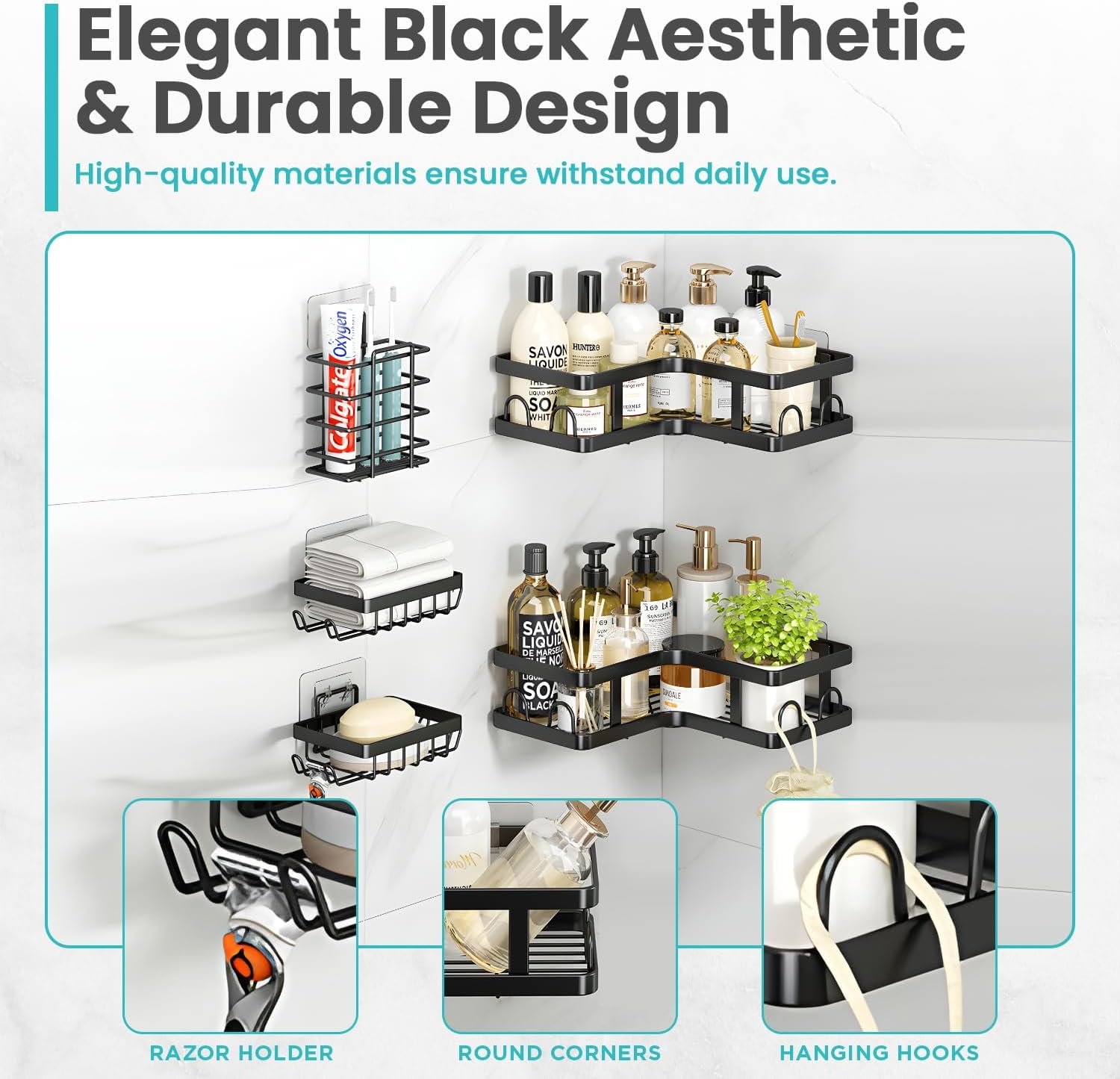 • āœ… Made from Premium Stainless Steel: Durable Materials: Crafted from high-quality stainless steel and coated with anti-rust paint, our black shower caddy is not only durable but also rust-proof, waterproof, and scratch-proof. The corrosion-resistant design is easy to clean and ideal for long-term use in humid environments. The hollow grid ensures quick water drainage, maintaining a clean and tidy shower space.